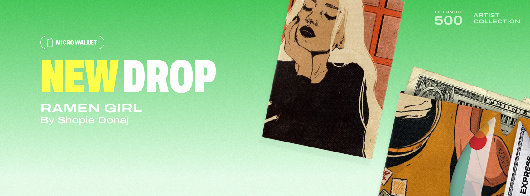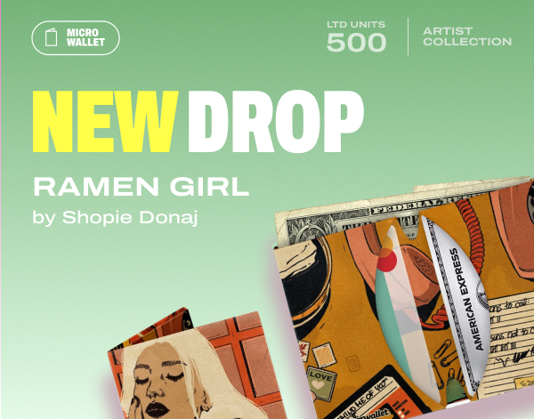 Sophie Donaj's Ramen Girl is a new Micro Wallet dropping April 24. Food illustration meets everyday carry.