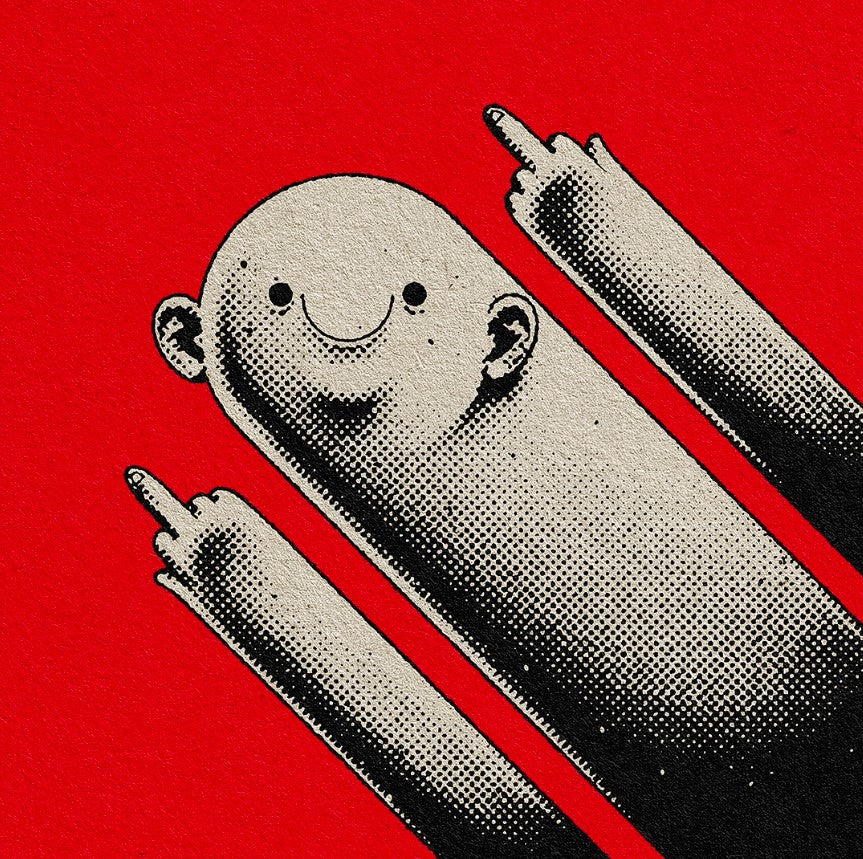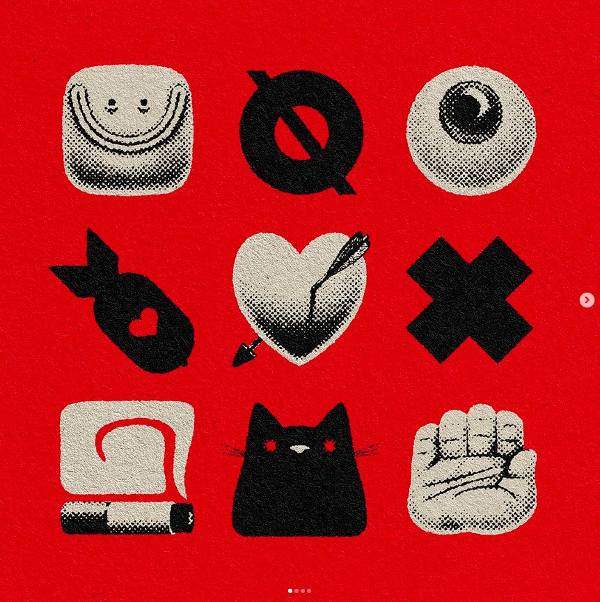 Jimi Biscuits is the red/yellow colour-blind familiar exorcised from the soul of Harry Waine during an ayahuasca ceremony. Since manifesting, Jimi has led Harry down artistic roads where the modern world’s human condition is explored with a cynical smile. Harry moves shapes around on a page until Jimi tells him to stop. The results are then thrown out into the world in the hope that they resonate and make others smile too. Life is joyful, devastating and everything in between. But if you look closely, it’s always bizarre.