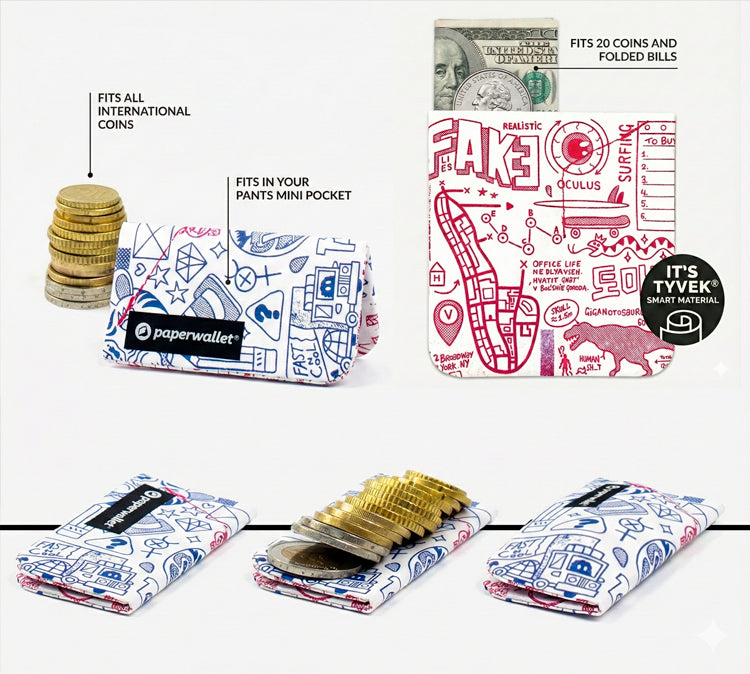paperwallets are crafted from Tyvek®, a durable, lightweight, waterproof material designed to match your active lifestyle. This synthetic material is constructed from high-density, recyclable polyethylene fibers.