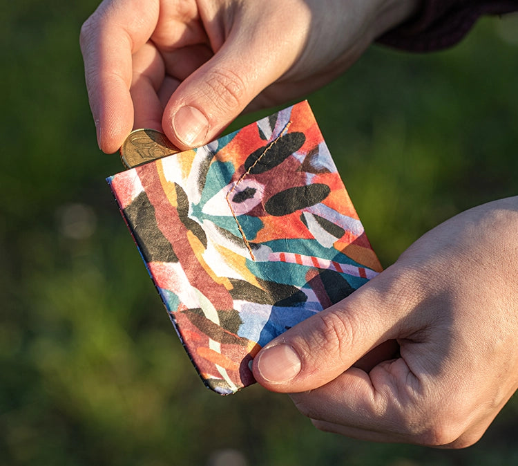 paperwallets are crafted from Tyvek®, a durable, lightweight, waterproof material designed to match your active lifestyle. This synthetic material is constructed from high-density, recyclable polyethylene fibers.