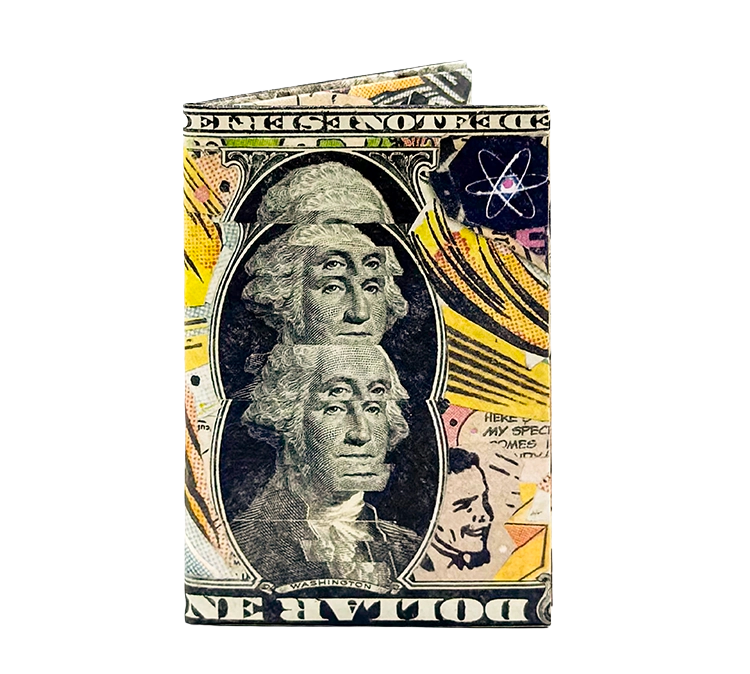 A pop-art dollar bill with George Washington's portrait front and center. Jaques Marquis reworks American currency into a colorful, slightly irreverent graphic. The familiar bill layout is there, but the colors and treatment turn it into something closer to a Warhol print than legal tender. It's tongue-in-cheek commentary on money, printed on a wallet.