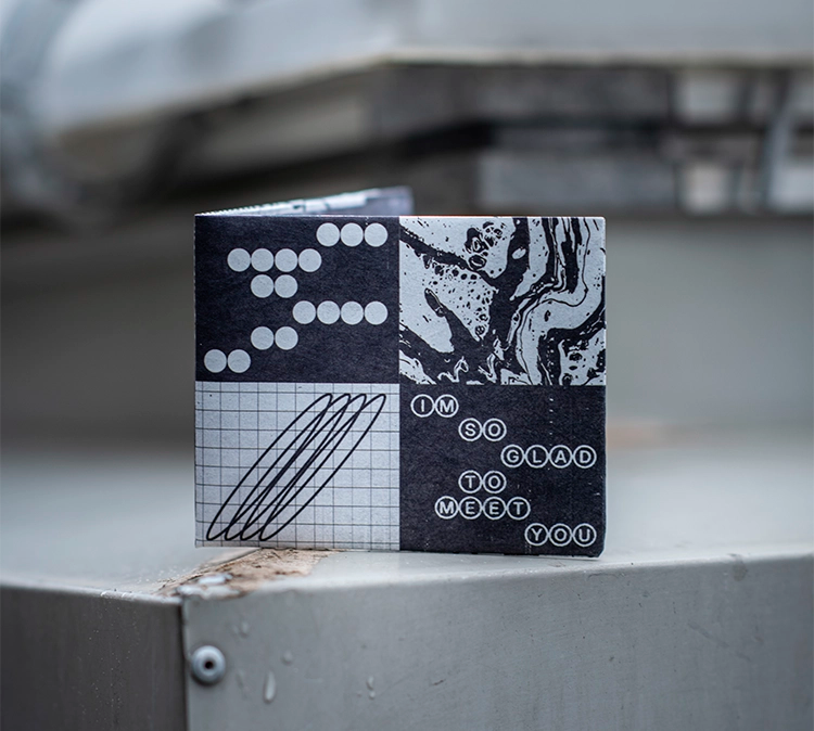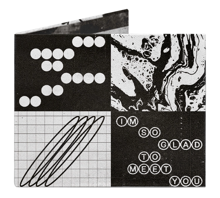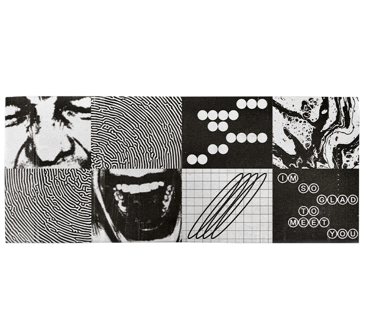 Fragmented faces and glitchy patterns collide in a stark monochrome grid. Yehor Bread delivers a high-contrast, experimental aesthetic that feels like a blend of analog film grain and digital distortion. The inclusion of the phrase "I'M SO GLAD TO MEET YOU" adds a surreal, greeting-card-gone-wrong vibe that is both bold and unsettling.