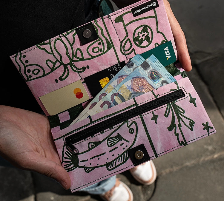 paperwallets are crafted from Tyvek®, a durable, lightweight, waterproof material designed to match your active lifestyle. This synthetic material is constructed from high-density, recyclable polyethylene fibers.