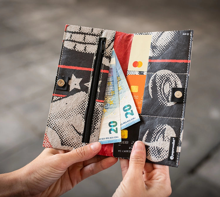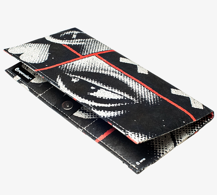paperwallets are crafted from Tyvek®, a durable, lightweight, waterproof material designed to match your active lifestyle. This synthetic material is constructed from high-density, recyclable polyethylene fibers.