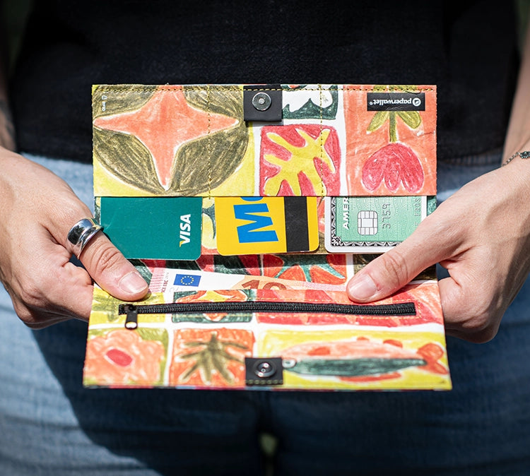 paperwallets are crafted from Tyvek®, a durable, lightweight, waterproof material designed to match your active lifestyle. This synthetic material is constructed from high-density, recyclable polyethylene fibers.