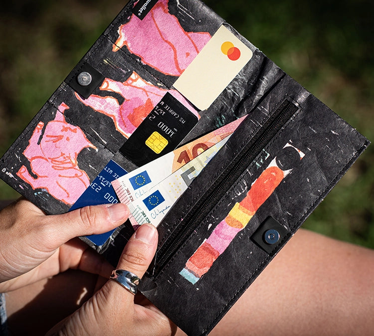 paperwallets are crafted from Tyvek®, a durable, lightweight, waterproof material designed to match your active lifestyle. This synthetic material is constructed from high-density, recyclable polyethylene fibers.