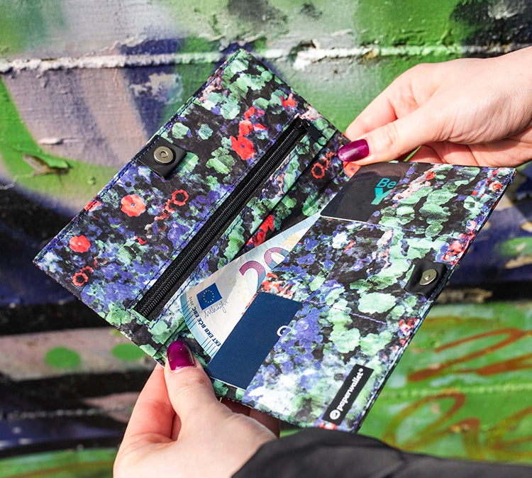 paperwallets are crafted from Tyvek®, a durable, lightweight, waterproof material designed to match your active lifestyle. This synthetic material is constructed from high-density, recyclable polyethylene fibers.