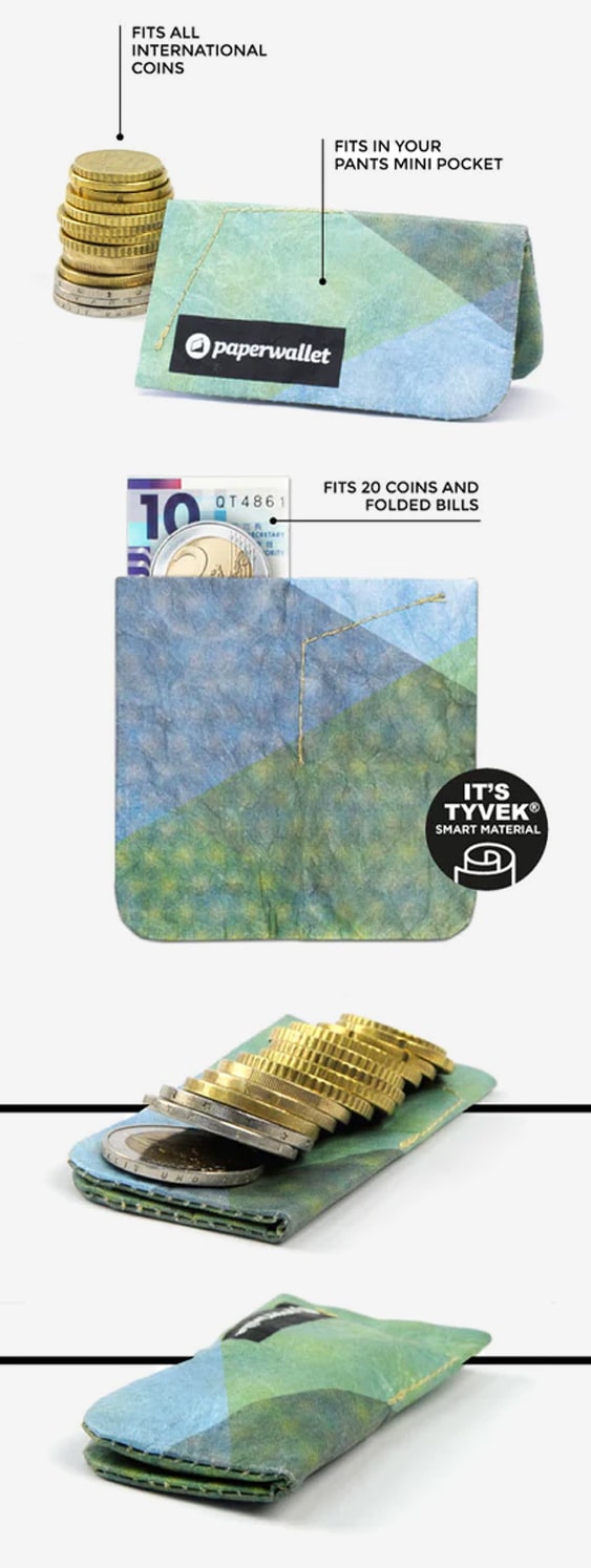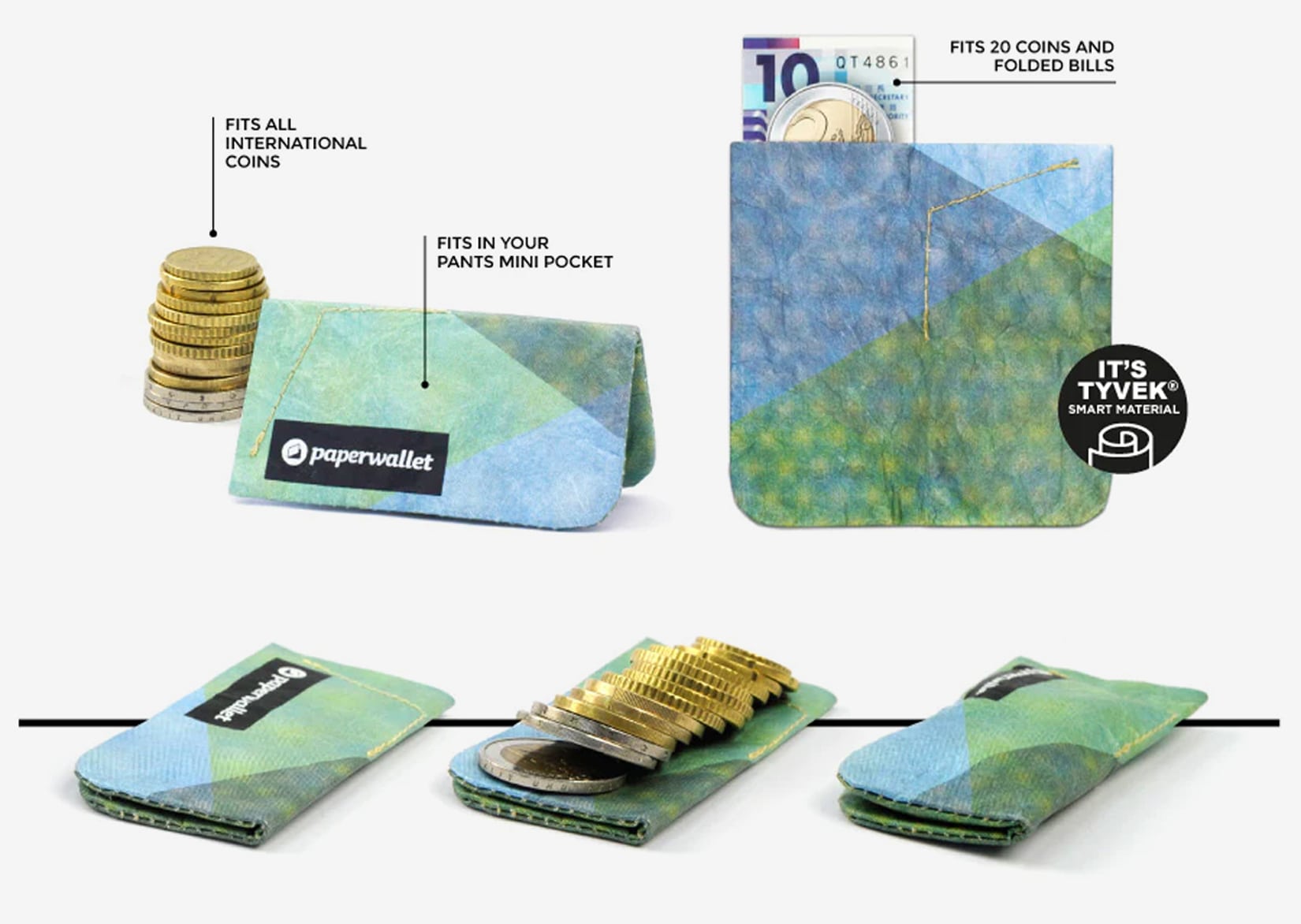 paperwallets are crafted from Tyvek®, a durable, lightweight, waterproof material designed to match your active lifestyle. This synthetic material is constructed from high-density, recyclable polyethylene fibers.