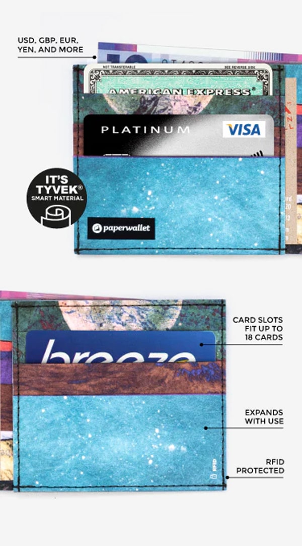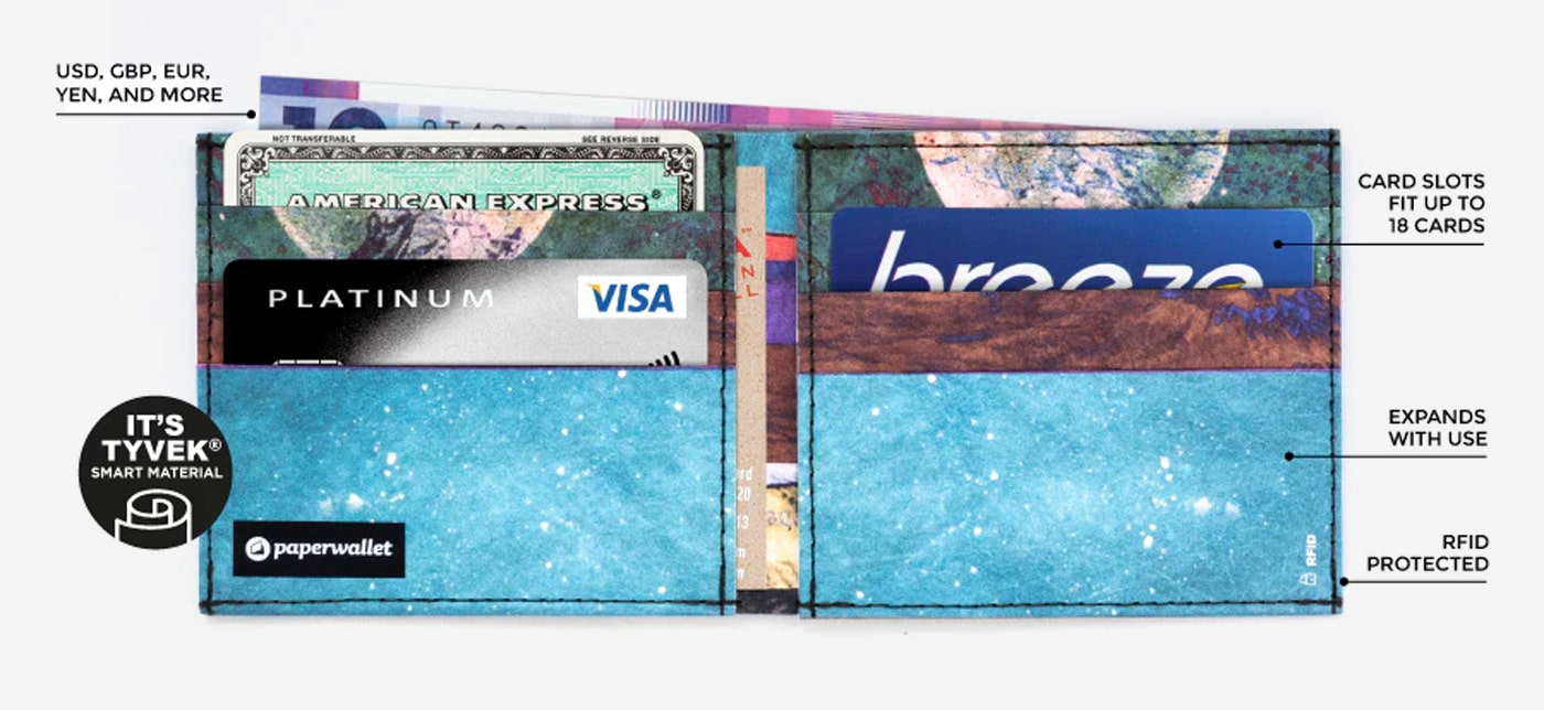 paperwallets are crafted from Tyvek®, a durable, lightweight, waterproof material designed to match your active lifestyle. This synthetic material is constructed from high-density, recyclable polyethylene fibers.