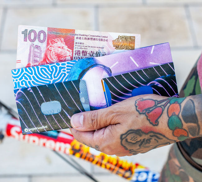 Our Slim Wallet is not only slim, simple & designed by artists but it also guarantees endurance being made from waterproof, tear proof, 100% recyclable Tyvek and this design comes fully RFID protected. The Slim Wallet’s expandable material allows 12 to 16 credit cards comfortably & plenty of cash making it the perfect minimalist wallet to keep your life organized and your pockets light.