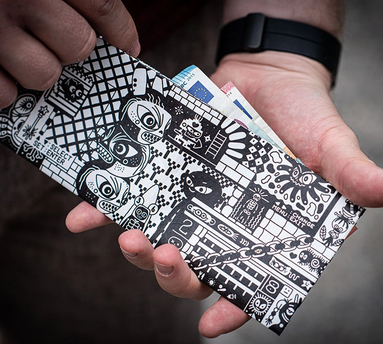 The Slim Wallet, made from durable Tyvek®, organizes your life with a sleek design. Waterproof and tear-proof, it comfortably holds 12-16 cards and cash. Unique artist-designed paperwallets add individuality.