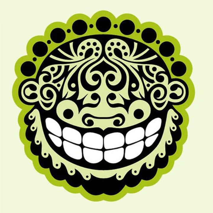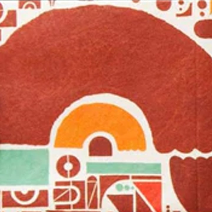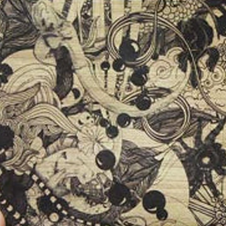 Crafts a visually controlled chaos, blending pre-Columbian stylized elements with simple interconnected details.