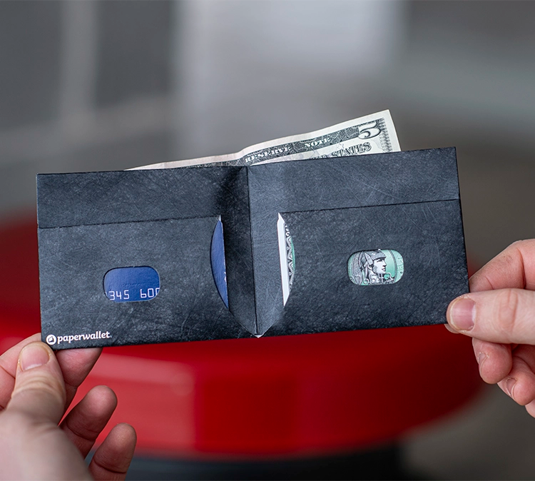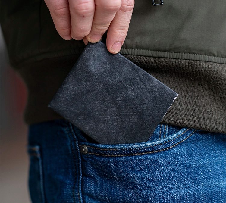 paperwallets are crafted from Tyvek®, a durable, lightweight, waterproof material designed to match your active lifestyle. This synthetic material is constructed from high-density, recyclable polyethylene fibers.