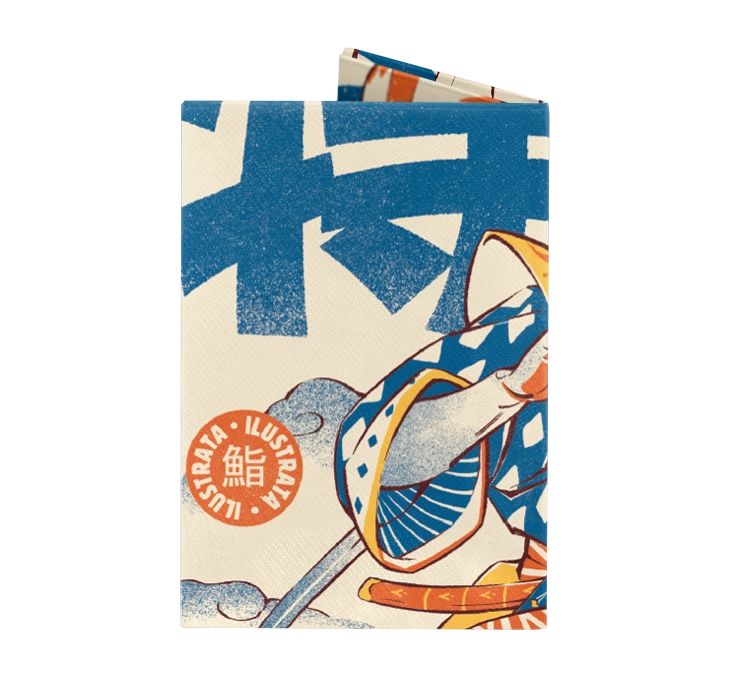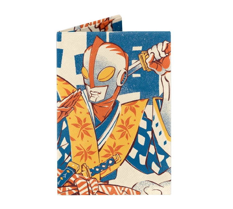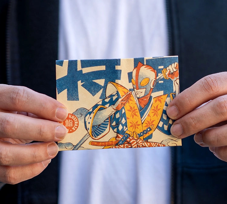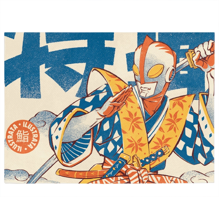 Ilustrata blends retro tokusatsu vibes with traditional Japanese woodblock aesthetics, the illustration features a heroic figure clad in patterned robes, wielding a katana against a backdrop of bold calligraphy. The grainy, screen-printed texture and vibrant blue and orange palette give it a timeless, high-impact feel that stands out in any collection.